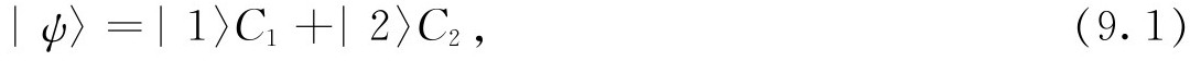在一个具有两种基础态的系统中,系统的任何态|ψ 〉总可用这两个基础态的线性组合来描写;这就是说,存在着处于一种基础态的一定振幅C 1 以及处于另一基础态的振幅C 2 。可以把系统的态矢量写成
