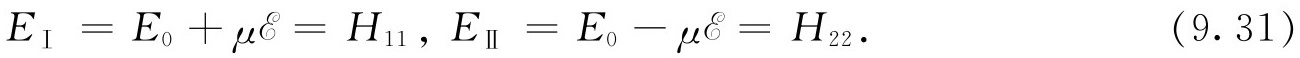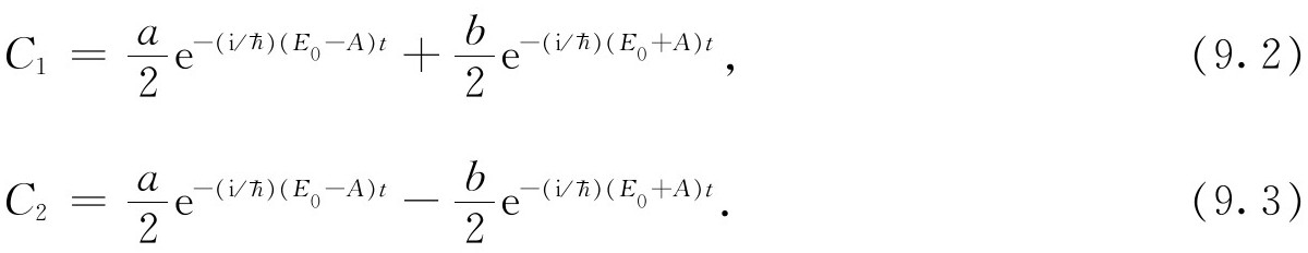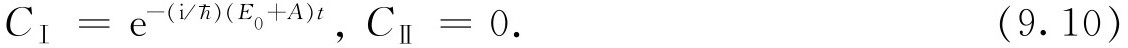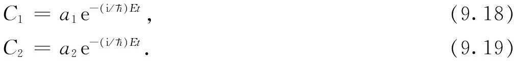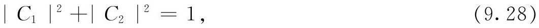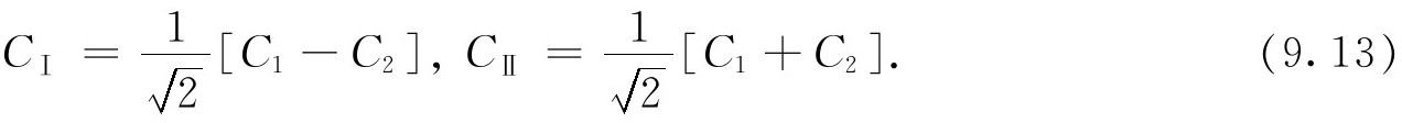 当然,我们上面所找到的两个定态|ψ Ⅰ 〉及|ψ Ⅱ 〉是方程式(9.8)及(9.9)的解。对于态|ψ Ⅰ 〉(这时C 1 =-C 2 )有