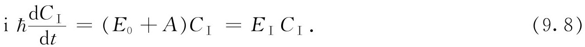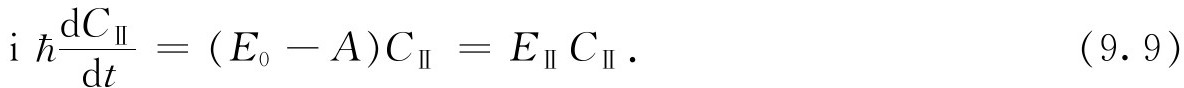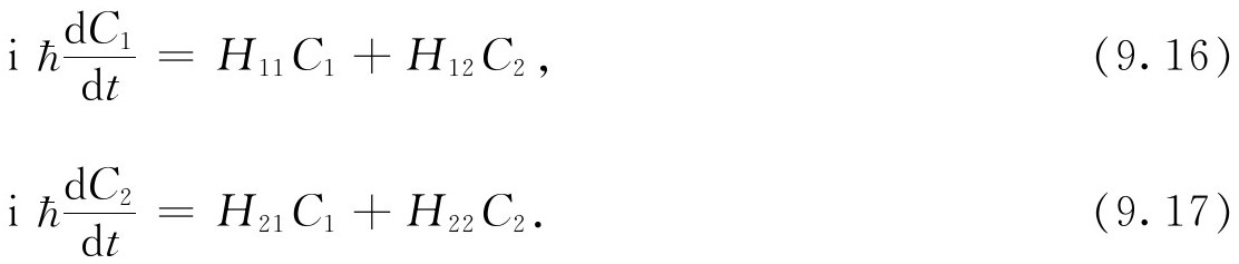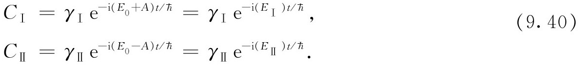 任何态Φ 处在我们的新基础态|Ⅰ〉及|Ⅱ〉中的振幅C Ⅰ =〈Ⅰ|Φ 〉及C Ⅱ =〈Ⅱ|Φ 〉也必须满足式(8.39)形式的哈密顿方程。事实上,若将式(9.2)减式(9.3)然后再对t 求导,就有
