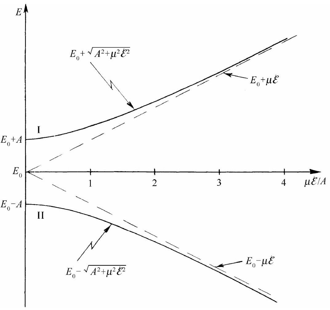 态|Ⅰ〉的物理组态与能量为(E 0 +A )的定态相同。同样,对第二个定态我们有