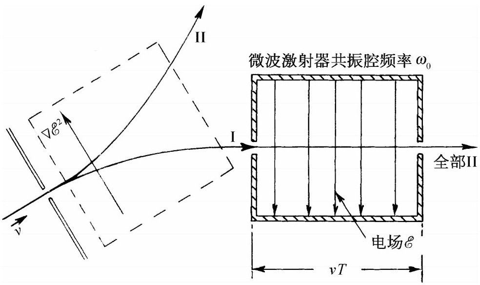在实际情况中,所有分子的速度并不都相同,它们具有某种形式的麦克斯韦分布。这意味着不同分子的理想的时间周期不相同,因此不可能同时对所有分子都获得100%的效率。此外,还存在另一种容易想到的复杂性,但此刻我们不想为此费心。大家记得腔内的电场通常在腔中处处不同。因此,当分子通过共振腔时,分子所在处的电场以比我们所假设的随时间作简谐式振荡更为复杂的方式变化。显然,必须用更繁复的积分来精确计算这个问题,但其基本概念仍然相同。