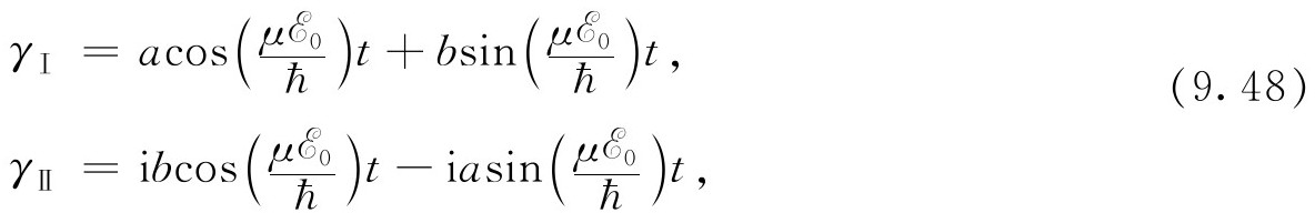 例如,设t =0时分子系统处在较高能态|Ⅰ〉,由式(9.40)可知,这要求t =0时γ Ⅰ =1及γ Ⅱ =0。在这种情况下,就要求a =1,b =0。往后某时刻t 分子处在态|Ⅰ〉的概率是γ Ⅰ 的绝对值平方,即