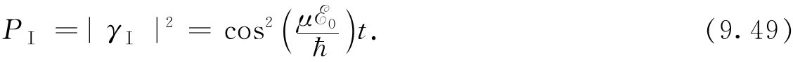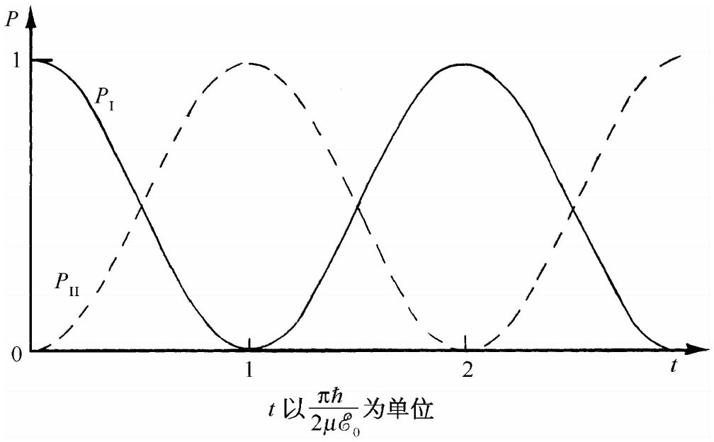 很小,并且处于共振情况下,概率就由简单的振荡函数给出。处在态|Ⅰ〉的概率由1下降为0,然后再回升到1,同时,处在态|Ⅱ〉的概率则由0上升到1,再下降。两种概率随时间的变化曲线如图9-5所示。不用说,两概率的和总是等于1,分子总得处在某个状态