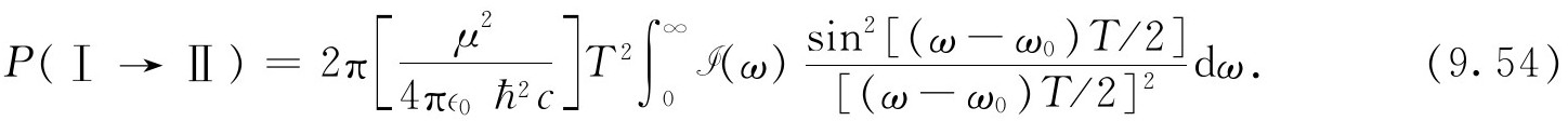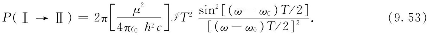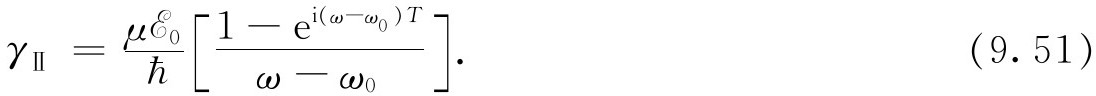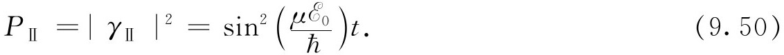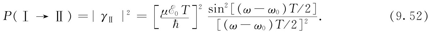 将此γ Ⅱ 值用于式(9.40)中即给出时间间隔T 内从态|Ⅰ〉跃迁至态|Ⅱ〉的振幅。发生跃迁的概率P (Ⅰ→Ⅱ)是|γ Ⅱ |2 ,即