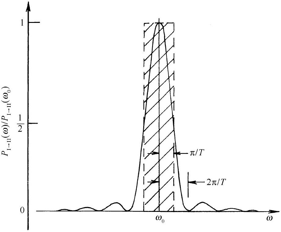 将在一定时间间隔内跃迁的概率作为共振腔频率的函数作图是很有意义的,从这可以看出在共振频率ω0 附近跃迁概率对频率依赖的灵敏程度。我们将这样的P (Ⅰ→Ⅱ)曲线画在图9-7中。(通过将纵坐标表示的概率除以ω=ω0 处的概率值,峰值的纵坐标被调整到1。)我们在衍射理论中已见到过这样的曲线,所以你们对它应该已经熟悉了。当(ω-ω0 )=2π /T 时,曲线相当迅速地下降至零,而对更大的频率偏差,再也不能重新达到可观的数值。事实上,曲线下面积的绝大部分位于±π /T 的区间之内,可以证明 (6) 曲线下的面积正好是2π /T ,并等于图中所画的阴影矩形的面积。