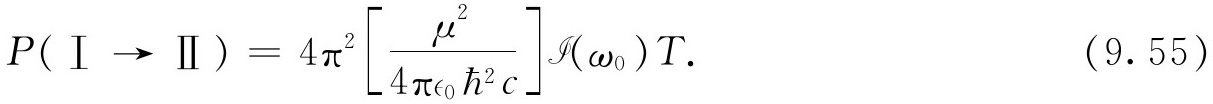 的两个状态之间在振荡电场中发生跃迁的振幅有关。所以,对任何特定情况,此振幅总是用我们这里所用的方法计算,并可得到如式(9.55)那样的表式。因此,我们要强调指出这个结果的下列几个特点。首先,概率正比于T。换句话说,单位时间发生跃迁的概率是常数。其次,这个概率正比于入射到系统上的光强