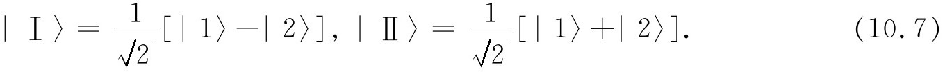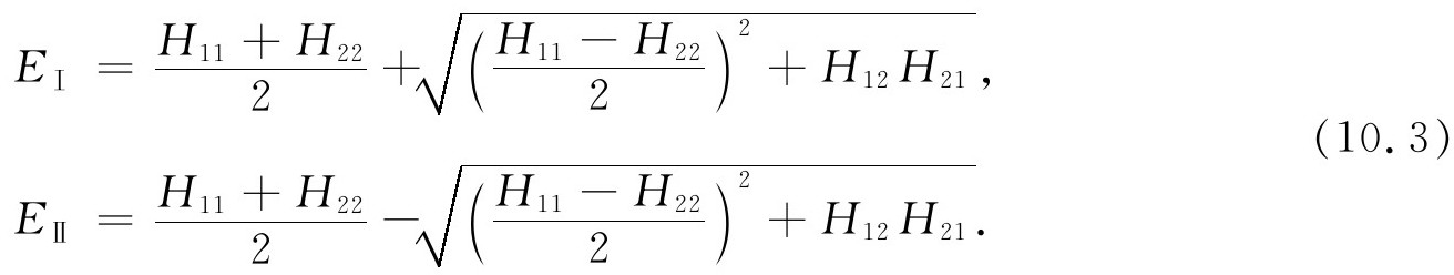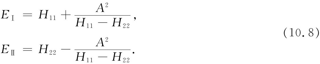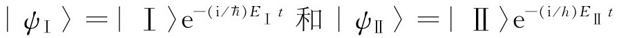 如H 11 与H 22 相等——比方说都等于E 0 ——而H 12 =H 21 =-A ,那么E Ⅰ =E 0 +A ,E Ⅱ =E 0 -A ,从而态|Ⅰ〉及|Ⅱ〉就特别简单:
