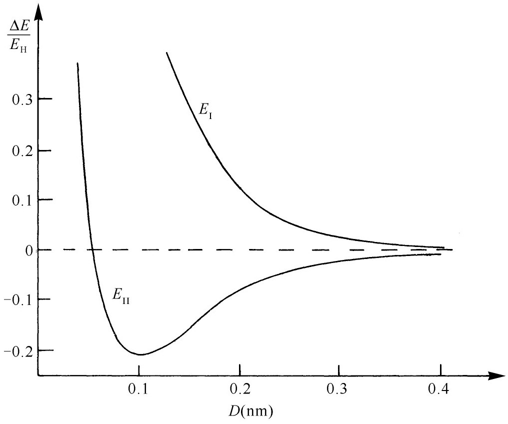 离子视为双态系统的近似处理就完全失效了,因而这时不能得到实际结合能的精确值。对于小间距,我们在图10-1中所设想的两种“态”的能量不再恰好等于E
