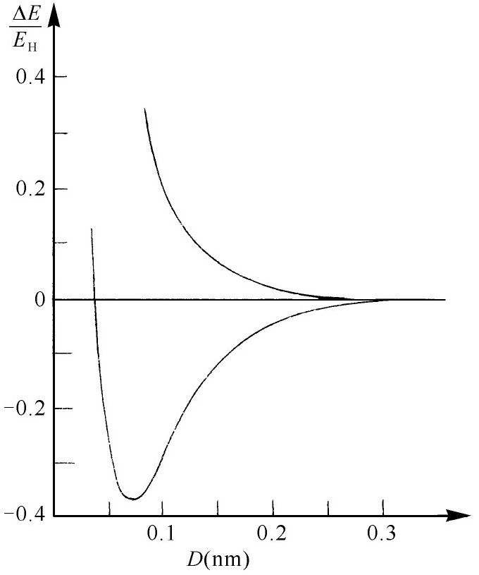 但是,我们忘了一件事。除了我们刚才所描写的力外,在两个质子间还存在着静电斥力。当两个质子相隔较远时——如图10-1中的那种情况——“裸”质子只见到一个中性原子,因此静电力可以忽略不计。但当距离十分靠近时,“裸”质子开始进入电子的分布区“内部”,就是说,平均而言,氢原子核离另一个质子比离电子为近。这样便开始出现一些额外的静电能,当然是正的。这个能量——也随距离而变化——应包括在E