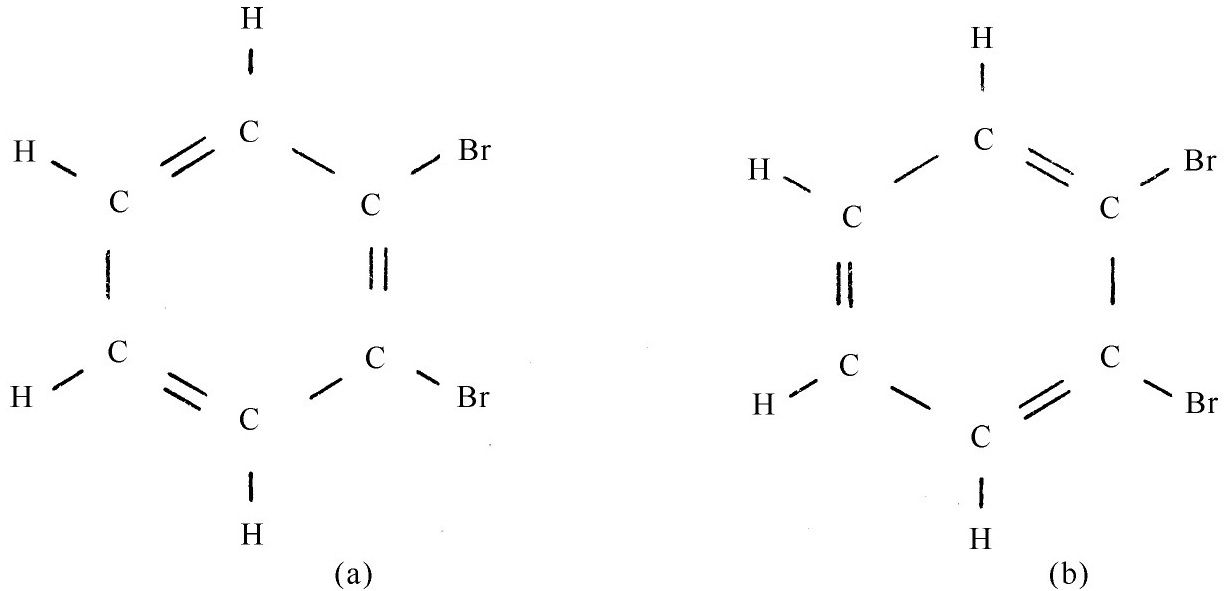 (2) 我们将事情稍微简单化了。原来,化学家认为应当有4种 形式的二溴苯:两种形式是溴原子连在相邻的碳原子上(邻二溴苯),第三种形式是溴原子相间地连在碳原子上(间二溴苯),而第四种形式是两个溴原子彼此相对(对二溴苯)。然而,他们只找到3种形式——只有1种 形式的邻位溴苯分子的形式。