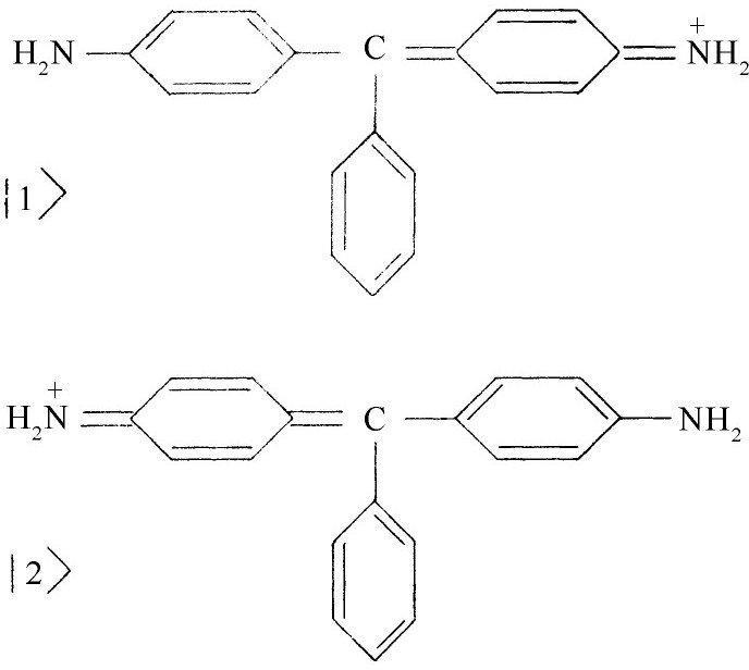 现在我们要利用这些结果来讨论一些取自化学和物理学领域中的有兴趣例子。第一个例子是氢分子的离子,一个带正电的电离氢分子由两个质子及一个电子组成,这个电子在两个质子周围运行。如果两个质子相离很远,我们预期这样的系统会有什么状态呢?答案很清楚:电子将靠近一个质子而形成一个处于最低能态的氢原子,而另一个质子则独自成为一个正离子。所以,如果两个质子离得很远,我们可想象这样一种物理状态,即电子“附着”在其中一个质子上。显然,还有另一种与之对称的状态,即电子靠近另一个质子,而第一个质子就成为一个离子。我们将取这两种态作为基础态,而称它们为|1〉及|2〉。两种态画在图10-1中。当然,一个电子靠近一个质子的状态实际上有许多,因为这种组合可以以任何一种氢原子的激发态存在。目前我们对这些各种各样的态并不感兴趣;我们只考虑氢原子处在最低能态——基态——的情况,而且我们暂时不考虑电子的自旋。我们可以假设在所有状态中电子都具有沿z 轴 (1) “朝上”的自旋。