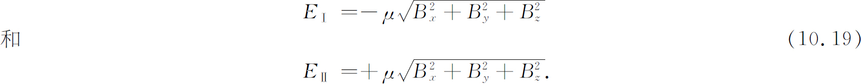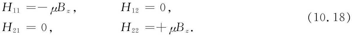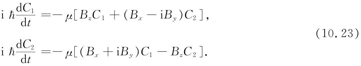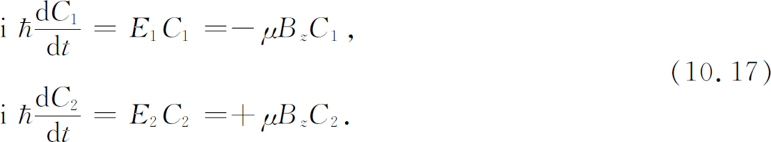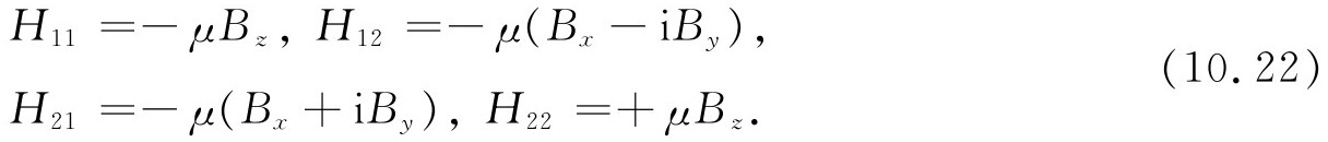 这样我们就找到了在磁场中电子的“自旋态的运动方程”。利用一些物理论证我们猜到了它们,但任何哈密顿的真正检验在于它应当作出与实验吻合的预言。至今所做过的任何检验都表明,这些方程是正确的。事实上,尽管我们的讨论只是恒定场,但所写出的哈密顿对于随时间变化的磁场也一样正确。所以我们现在可以用式(10.23)来考察种种有趣问题了。