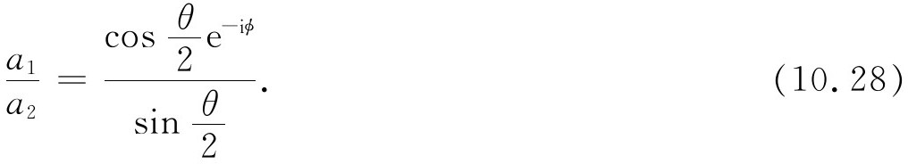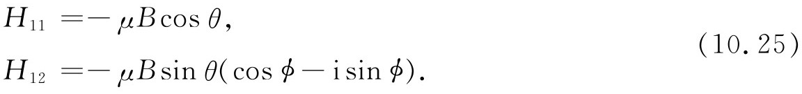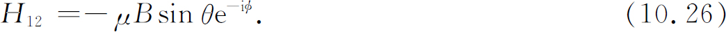 现在让我们来考察下面的问题。假设有磁场B ,它指向极角为θ 和方位角为Φ 的方向,如图10-10所示。此外还假定有一个电子,而且我们已使它的自旋方向与磁场方向相同。这一电子的振幅C 1 与C 2 是什么?换句话说,令电子状态为|ψ 〉,我们可以写出