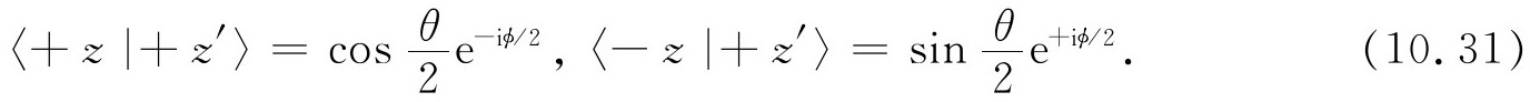 设|+z 〉表示自旋沿z 轴朝上的态,|-z 〉则表示自旋朝下的态。如|+z ′〉表示自旋沿z ′轴朝上的态,而z ′轴与z 轴成极角θ 和方位角Φ ,那么按第5章的记号,我们有