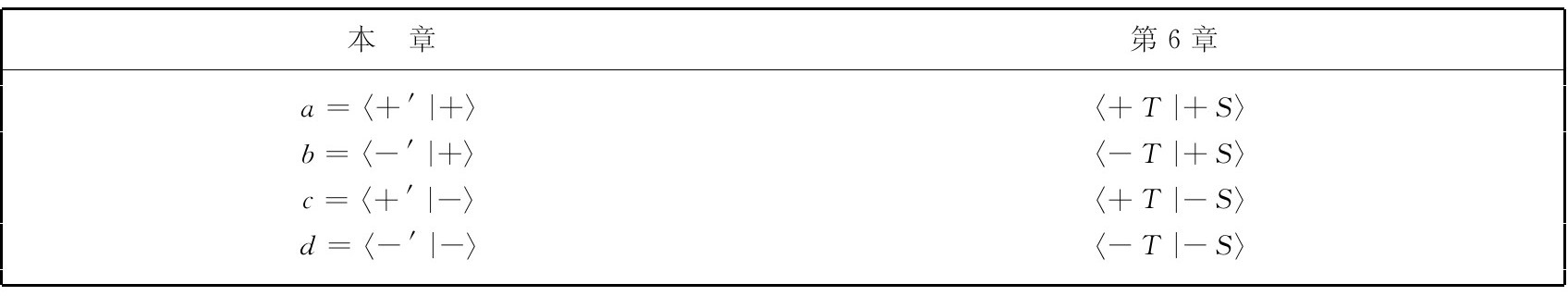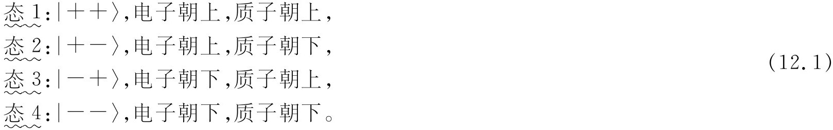 你一定得记住,第一个 +或-号表示电子,而第二个 则表示质子。为便于参考,我们已把这些记法总结在图12-1中。有时也把这些态方便地记为|1〉,|2〉,|3〉和|4〉。