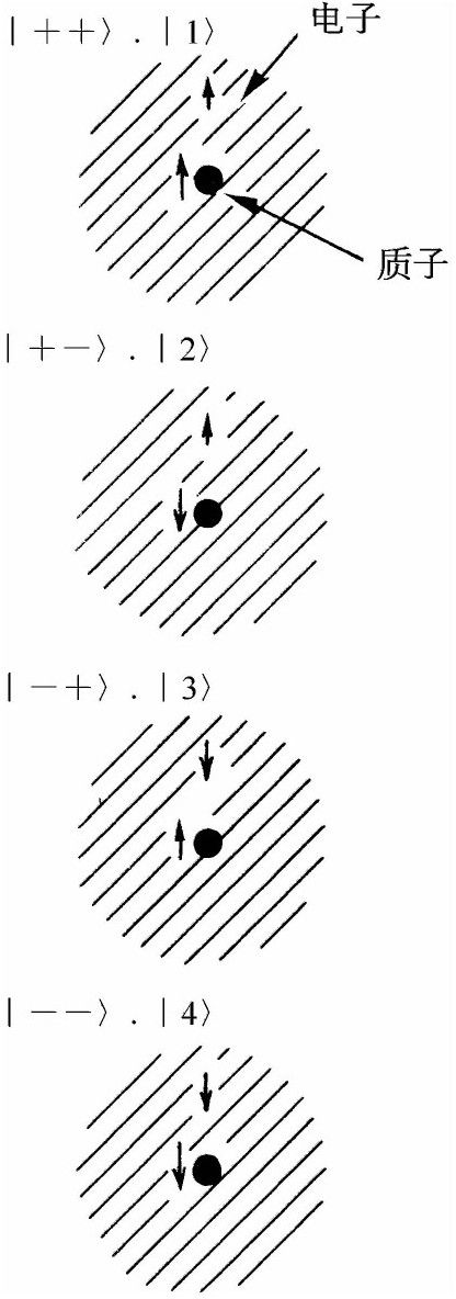 就我们的目的而言,我们对电子和质子空间位置 的细节丝毫不感兴趣,因为它们的位置由原子结构决定——原子进入基态本身就决定了它们的位置。我们需要知道的只是电子和质子以某种确定的空间关系彼此靠近。此外,它们的自旋可以有多种不同的相对取向。我们要研究的只是自旋的效应。