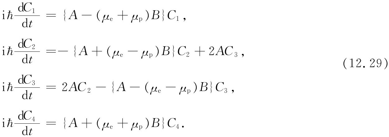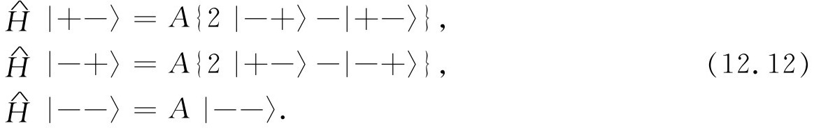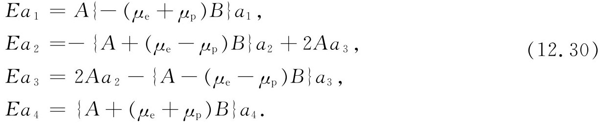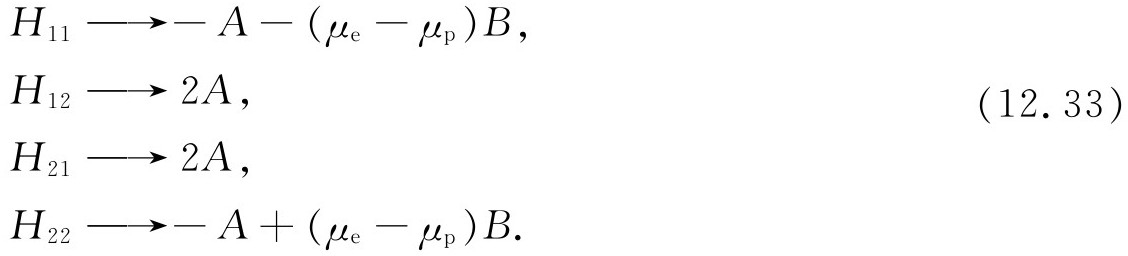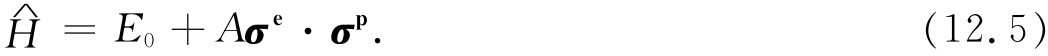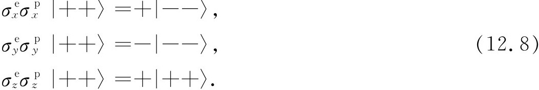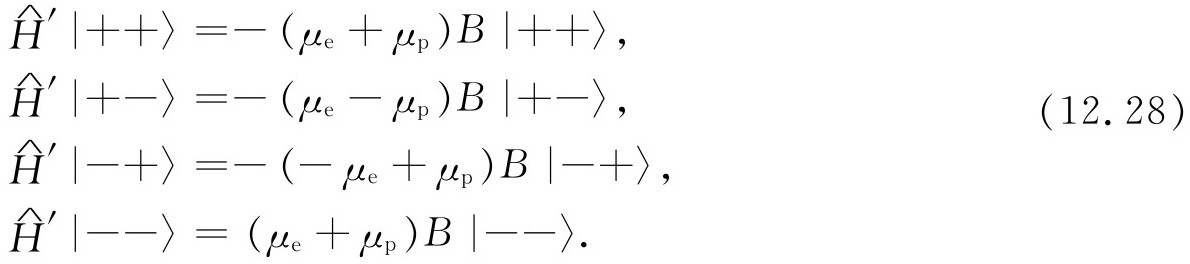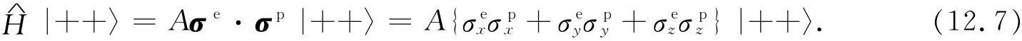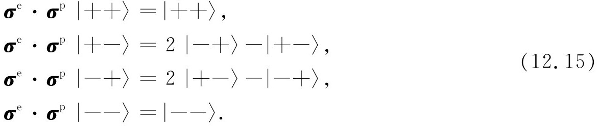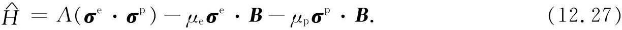就研究氢原子基态而言,我们不需要用到全部不同动量的基础态。当我们说“基态”时,我们是指特定的质子和电子的动量状态。组态——所有动量基础态的振幅——的细节是可以计算的,但这是另一个问题。现在所关心的只是自旋效应,因此可只取式(12.1)的4个基础态。接下来的问题是:对于这组基础态的哈密顿是什么?