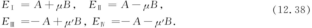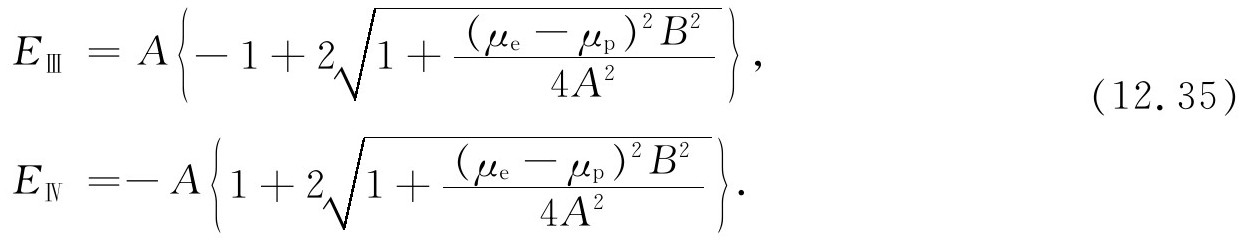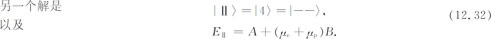 现在假定电子自旋“朝下”,它在外磁场中的能量为μ e B 。如果质子自旋也“朝下”,两者合在一起具有能量(μ e +μ p )B =-μ B ,加上 它们的相互作用能A ——因为它们的自旋平行。这正好就是式(12.38)中的能量E Ⅱ ,且相应于态|——〉=|Ⅱ〉——这很妙。最后,若电子自旋“朝下”而质子自旋“朝上”,我们得到能量(μ e -μ p )B -A (相互作用能取为负 A 是因为两个自旋相反),它刚好就是E Ⅳ ,而相应的态为|-+〉。