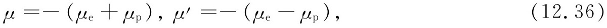 (5) 请记住,在经典理论中U =-μ•B ,所以当磁矩沿着磁场方向时能量最低。对于带正电荷的粒子,磁矩平行于自旋,带负电荷的粒子则相反。所以在式(12.27)中μ p 是正数,而μ e 是负数。