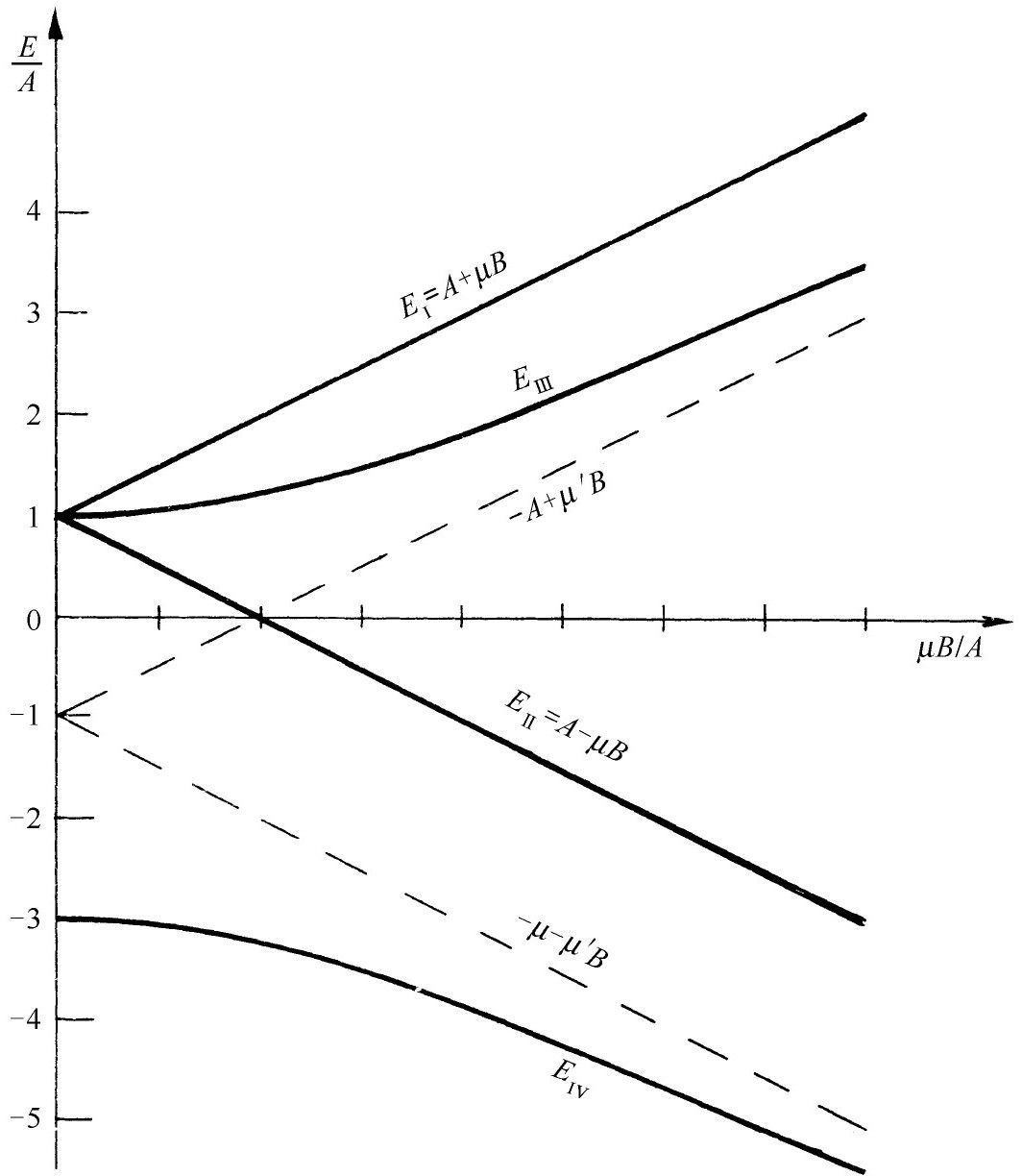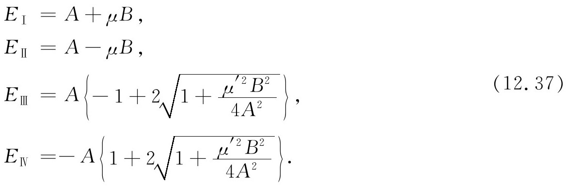 对于强磁场B ,态|Ⅲ〉的C 2 ≫C 3 ,该态几乎完全成了态|2〉=|+-〉。同样,如果在式(12.39)中代入E Ⅳ ,则得(C 2 /C 3 )Ⅳ ≪1;强场中态|Ⅳ〉正好成为态|3〉=|-+〉。你们看到构成定态的基础态的线性组合的系数与B 有关。我们称为|Ⅲ〉的态在极弱磁场的情况下是|+-〉和|-+〉的50-50的混合态,但是在强场中就完全转移到|+-〉。同样,态|Ⅳ〉在弱场中也是|+-〉和|-+〉(具有相反的符号)的50-50的混合态,但当自旋在强的外场中解耦合后态|Ⅳ〉就趋向态|-+〉。