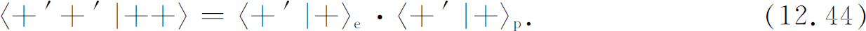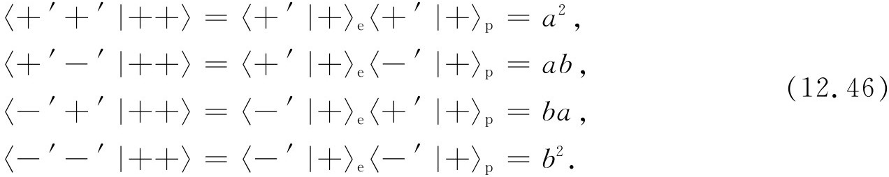 我们可用下述方法求振幅〈+′+′|++〉。在我们的 参考系中,处在|++〉态的电子 具有“朝上”的自旋。这意味着在他的 参考系中具有“朝上”的振幅〈+′|+〉e ,以及“朝下”的振幅〈-′|+〉e 。同样,处在|++〉态的质子 在我们的参考系中自旋“朝上”,而在带撇的参考系中,具有自旋“朝上”和“朝下”的振幅分别为〈+′|+〉p 和〈-′|+〉p 。既然我们现在谈论的是两个不同的粒子,因此这两个 粒子在他的 参考系中一同“朝上”的振幅为上述两个振幅的乘积,即