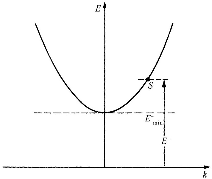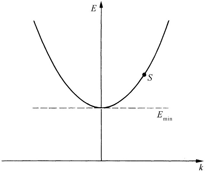 其中α 是某一常数。我们可以画出E 对k 的函数图。如图14-1所示。我们把这种图称为“能量图”。一个处于特定能量和动量状态的电子可以用图上的一点(如S 点)来表示。