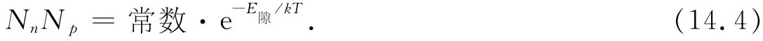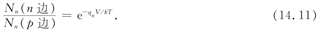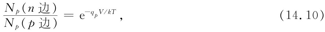 注意,假如方程式(14.10)和(14.11)给出同样的电势差V 数值,乘积N p N n 无论在p 的一边还是在n 一边必定相同。(记住q n =-q p 。)然而,我们前面已经看到,这一乘积只依赖于温度和晶体的隙能。假定晶体的两边都处于同样的温度,这两个方程式中的电势差具有同一数值。