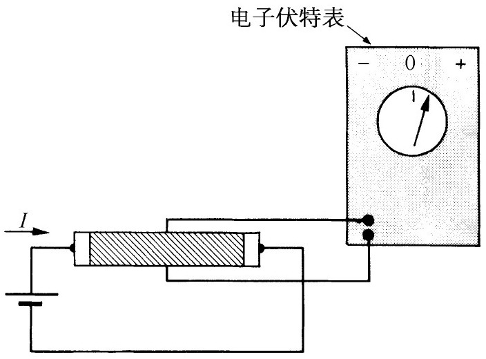 只有电子是相对自由的客体的材料中,也会有行为像正粒子的空穴所运载的电流,这确实是一件难以理解的事。因此,我们要描写一个实验,这实验能十分明确地证明电流的载流子绝对肯定是正的。假设我们有一块半导体材料——也可以是金属——我们在上面加上电场,从而在某个方向引起电流,例如水平方向,如图14-6所示。现在假设我们在这块材料上再加上磁场,其指向和电流方向成直角,譬如说指向 图的里面 。运动着的载流子会感受到磁力q (v ×B )的作用。由于平均漂移速度不是向右就是向左——取决于载流子上电荷的符号——作用于载流子上的平均磁力不是向上就是向下。不,这是不对的!对于我们所假定的电流和磁场方向,作用于运动电荷上的磁力总是向上 的。正电荷在j 的方向上运动(向右)会受到向上的力。如果电流由负电荷运载,它们向左运动(对于同样符号的传导电流),于是它们也会受到向上的力。然而,在稳定情况下,载流子并没有向上的运动,因为电流只能从左边流到右边。所发生的过程是,开始时有一些电荷向上流动,在半导体的上表面形成面电荷密度——在晶体的下表面上留下相等但相反的面电荷密度。电荷聚集在上表面和下表面上,直到它们作用于运动着的电荷上的电力正好和(平均的)磁力完全相抵消,因此稳恒电流照旧水平地流动。上表面和下表面上的电荷将产生一个垂直跨过晶体的电势差,可以用高电阻伏特计来测量这电势差,如图14-7所示。伏特计记录的电势差的符号取决于形成电流的载流子的电荷的符号。