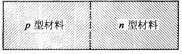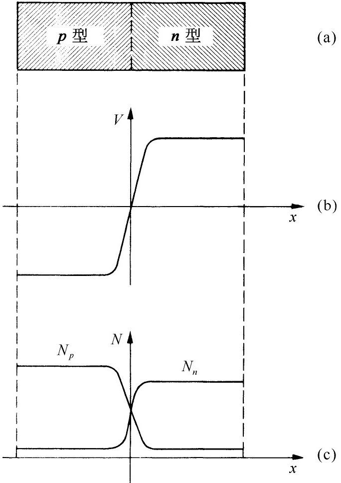 在p-n 结的n 型一边有可以运动的自由电子,还有使总电荷平衡的固定的施主位。在p 型的一边有自由空穴运动着,并有等量的受主位使电荷平衡。实际上这描写的是我们使两种材料相互接触之前的状况。一旦它们联结在一起,靠近交界处的情况就改变了。当n 型材料中的电子到达边界时,它们并不像在自由表面上那样被反射回去,而可以一直进入p 型材料。因此,n 型材料中的一些电子会扩散到电子比较少的p 型材料中。这过程不会一直进行下去,因为当n 型的一边失去电子后净的正电荷就要增加,直到最后建立起一个电压以阻止电子扩散到p 型一边去。同样,p 型材料中的正载流子通过结扩散进入n 型材料中。当它们这样做时,在后面留下了过量的负电荷。在平衡条件下,净扩散电流必定等于零。这是由电场造成的,因为所建立的电场要把正载流子拉回p 型材料。