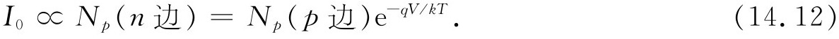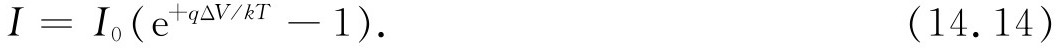 当ΔV 为零,式(14.14)中的净电流为零。对于正的ΔV ,电流随外加电压很快增加。对于负的ΔV ,电流改变符号,但是指数项很快变为可忽略,并且负的电流永远不会超过I 0 ——按照我们的假设这I 0 是相当小的。这个反向电流I 0 被结的n 边少数p 型载流子很小的密度所限制。