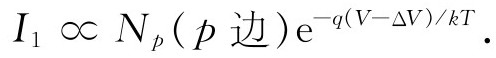 不过,假定我们使结的n 边的电压降低一个数量ΔV ——我们可以通过在结上加上外电势差来做到这一点。现在电势坡两面的电势差不再是V 而是V -ΔV 。从p 边到n 边的正载流子电流的表式中这个电势差在指数因子中出现。令这个电流为I 1 ,我们有