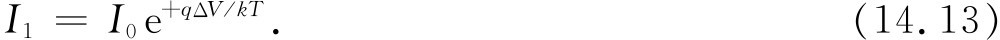 如果你对流过结的负载流子的电流作完全相同的分析,首先对没有电势差的情形,然后对小的外加电势差ΔV ,你会再次得到完全和式(14.14)一样的净电子电流的方程式。因为总电流是两种载流子贡献的电流之和,倘若我们认为I 0 是加上反向电压时可能流过的最大电流,那么式(14.14)完全可用总全电流。
