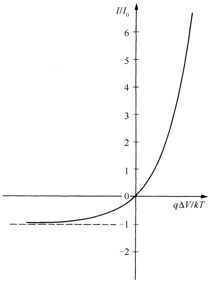 来自p 边的电流随着外加电压ΔV 指数式地增加。然而,只要ΔV 不太大从n 边来的正载流子的电流保持不变。当它们来到势垒,这些载流子还是会发现向下的电势坡并且全部降落到p 边。(如果ΔV 大于自然电势差V ,情形就不同了,但是我们不去考虑在这样高的电压下会发生些什么。)穿过结的正载流子的净电流I 就是两边来的电流之差: