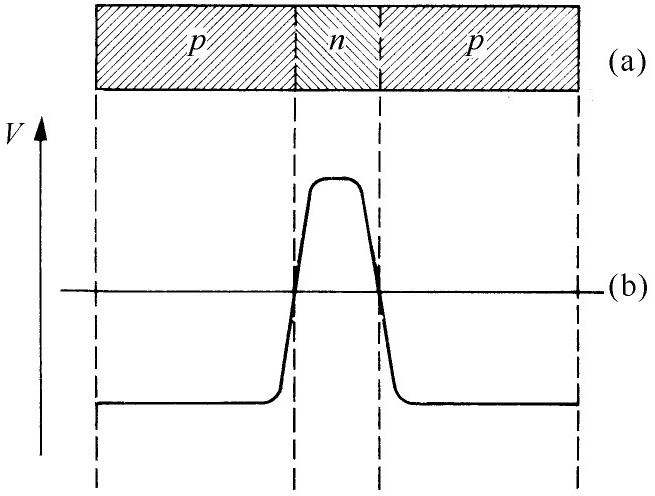 或许半导体最重要的应用是晶体管。晶体管由两个互相靠得非常近的半导体结组成。它的工作原理有一部分与我们刚才描写的关于半导体二极管即整流结的原理相同。假设我们制造一小块锗,上面有3个不同的区域,一个p 型区域,一个n 型区域,以及另一个p 型区域,如图14-11(a)所示。这一组合称作p-n-p 晶体管。晶体管中的这两个结的行为都和我们在上一节中所描写的一样。特别是每一个结上都有一个电势梯度,从n 型区域到每一个p 型区域都有一定的电势降落。假如两个p 型区域有同样的内部性质,我们沿着晶体观察,测量到的电势变化就如图14-11(b)所示。