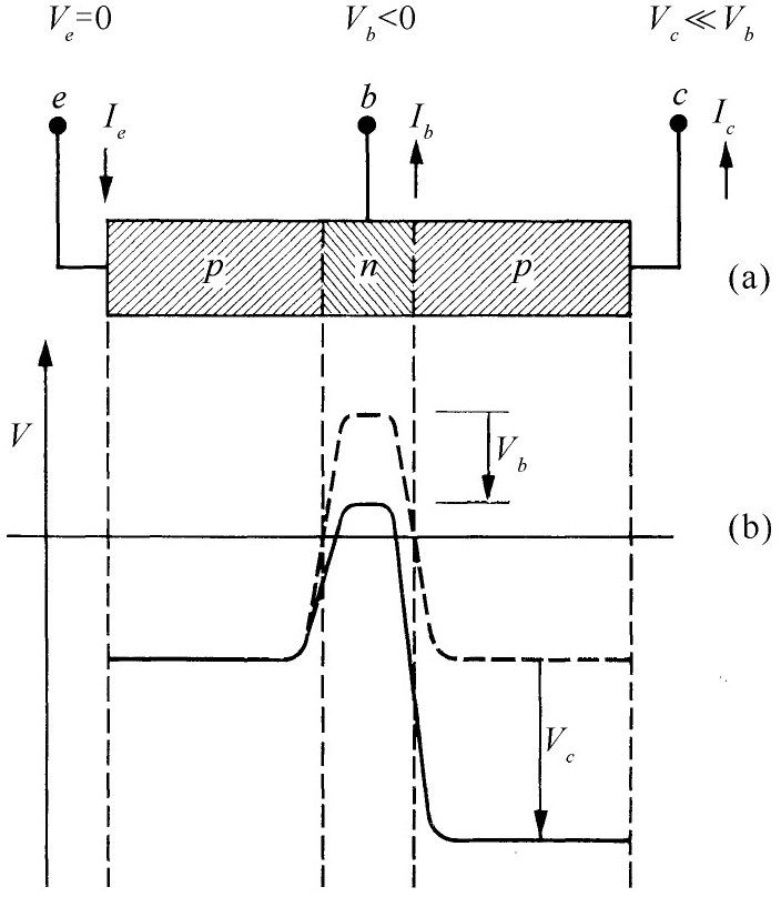 我们先来看一看正载流子的情形,因为主要是它的行为控制着p-n-p 晶体管的工作。既然发射极相对于基极是处在正电势,正载流子的电流就会从发射极区流入基极区。由于结在“正向电压”作用下——相应于图14-10中图的右半部分——流过的电流比较大。在这样的条件下,正载流子或空穴从p 型区域被“发射”到n 型区域。你可能想象这个电流会通过基极的端点b 流出n 型区域。然而,现在接触到了晶体管的奥秘了。n型区域做得非常薄——典型的厚度是10-3 cm或更小,大大小于它们的横向线度。这意味着当空穴进入n 型区域后,在和n 型区域中的电子湮没之前有很大的机会扩散到另一个结。当它们到达n 型区域的右方边界时,它们遇到急剧下降的电势坡并立即落入右方的p 型区域。晶体的这一边称为集电极,因为它“收集”扩散穿过n 型区域的空穴。在一个典型的晶体管中,除了很小的百分比以外,离开发射极并进入基极的空穴电流大多在集电极区域被收集起来,其余只有很少一部分贡献净的基极电流。基极和集电极电流之和显然等于发射极电流。