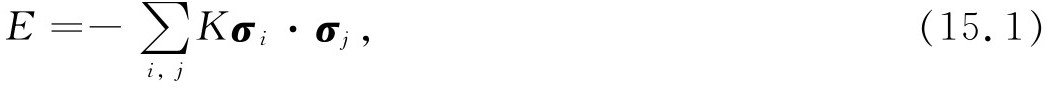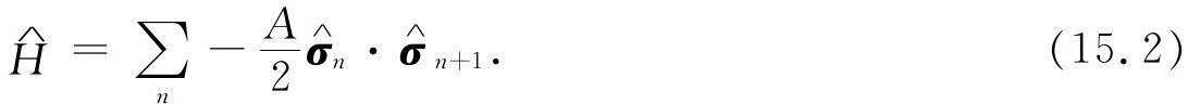 我们举一个所有原子都排成一条直线即一维晶格的简单例子来说明一些问题。你们很容易将这些概念推广到三维的情形。在每一个原子的位置上都有一个电子,每个电子都有两个可能的状态,不是自旋朝上就是自旋朝下,整个系统可通过说明所有自旋是如何排列的来描述。我们取体系的哈密顿作为相互作用的能量算符。将式(15.1)中的自旋矢量解释为σ 算符(或σ 矩阵),对于线性晶格我们可写出: