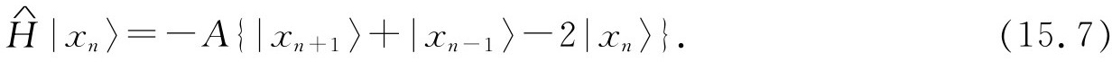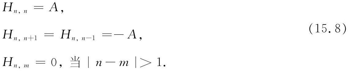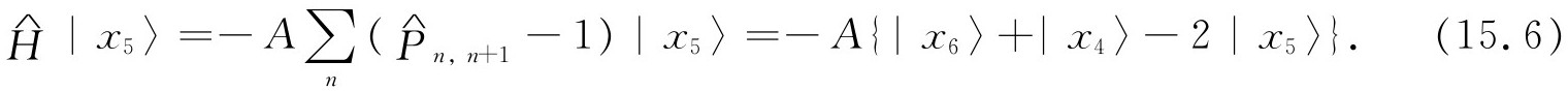当哈密顿作用在态|x 5 〉上时,它给出了一些处在态|x 4 〉和|x 6 〉的振幅,这就意味着向下的自旋跳跃到相邻原子上具有一定振幅。由于自旋之间的相互作用,如果开始时某一个自旋向下,那么在以后的时刻,另一个原子代替它变成自旋向下就有一定的概率。将哈密顿作用在一般态|x n 〉上就给出: