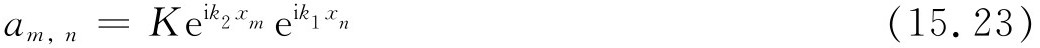 在上节中,我们已经写出了两个粒子系统的哈密顿式(15.15)。然后取近似,这近似相当于忽略两个粒子间任何“相互作用”,我们求得了由式(15.17)和(15.18)所描述的定态,这个态正好就是两个单粒子态的乘积。然而,我们对于式(15.18)中a m,n 的解实在并不满意。我们早就谨慎地指出,态|x 9 ,x 4 〉与|x 4 ,x 9 〉并无 区别——x m 和x n 的次序 没有什么意义。一般来说,如果我们交换x m 和x n 的值,振幅C m,n 的代数表达式必须不变。因为这种交换并不改变状态,不管怎么说,它应代表在x m 处及x n 处各找到一个向下自旋的态的振幅。但是要注意,由于k 1 和k 2 通常是不同的,式(15.18)对x m 和x n 并不对称。