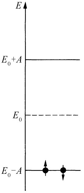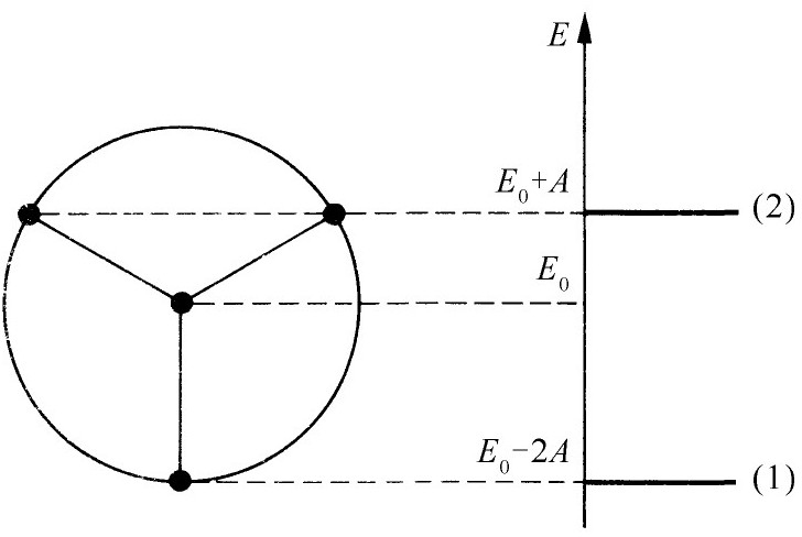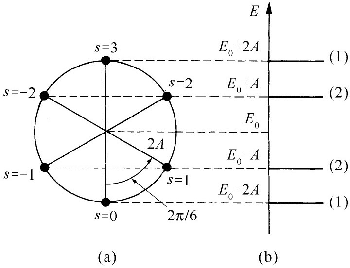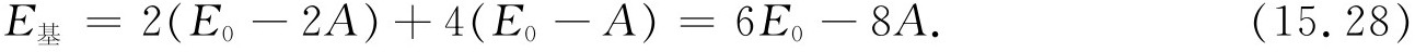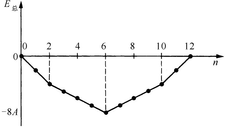 对于苯分子来说,我们必须放进6个电子。对基态来说,它们要进入可能最低的能量状态——两个电子处在s =0,两个电子处在s =+1,另两个电子处在s =-1。按照独立粒子近似,该基态能量为