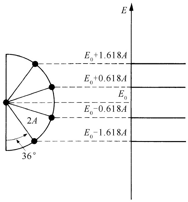 我们也可用一个与苯的情形相似的圆来表示能级。这次我们用分成5个相等部分的半圆,如图15-11所示。位于底部的点对应于s =0,它根本没有给出什么态,顶上对应于s =N +1的一点也是如此。剩下的4点给出了4个允许的能量。一共有4个定态,我们从4个基础态出发所期望的正是这一情况,在圆图中,各个角度间隔为π /5或36°。最低能量为(E 0 -1.618A)。(啊,多奇妙的数学方法!按照这个理论,希腊人 (5) 的黄金分割给了我们丁二烯分子的最低能量态!)