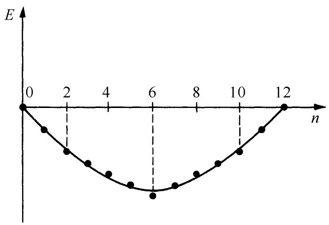 另外一个概念是从这类理论在有机化学的应用中出现的。它或许是最为成功的,或者至少在某种意义上说是最精确的。这个概念和下面的问题有关:在什么条件下我们才能得到特别强的化学键联?回答是很有趣的。首先以苯为例,我们设想事件发生的次序为:从六重电离分子开始,然后逐步增加电子。于是我们会想到各种苯离子——负的或正的。假定我们把离子(或中性分子)的能量作为电子数目的函数来作图。如果我们取E 0 =0(因为我们不知道E 0 是多少),我们得到如图15-13所示的曲线。对于最早放入的两个电子,函数的斜率是一条直线,对于相继放入的每一组电子,斜率增加,而各组电子之间的斜率是不连续变化的。当我们刚好填满了一组能量相同的能级,而必须把电子填到下一组能量较高的能级上去的时候,斜率就要改变。